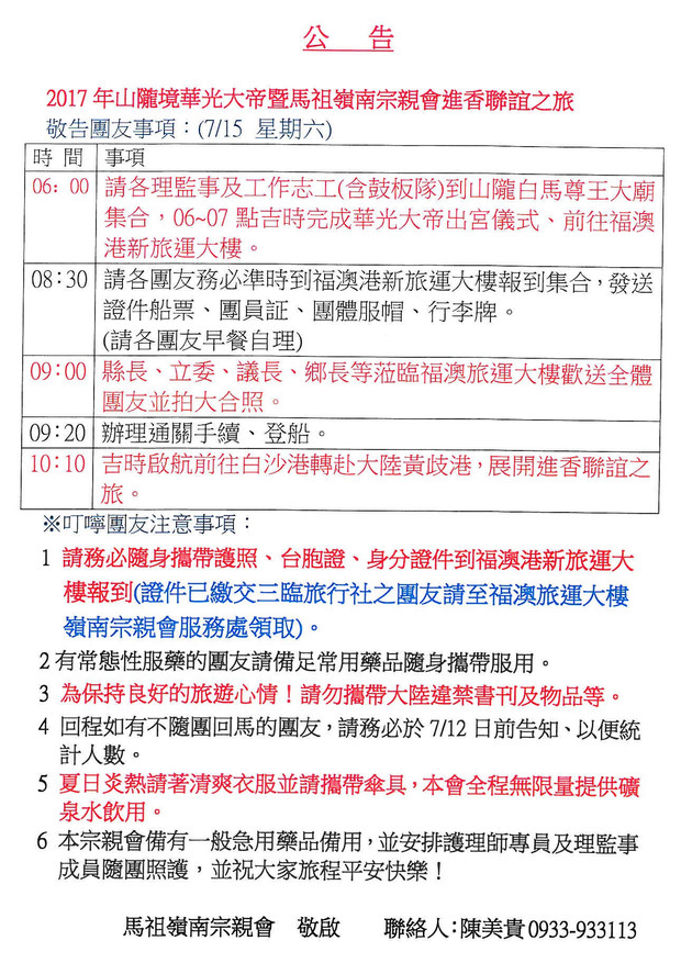 馬祖嶺南宗親會進香聯誼之旅 公告
