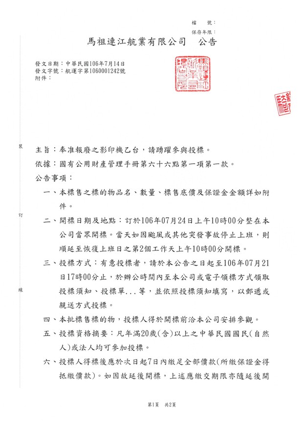 連江航業-標售報廢影印機乙台 --閱讀人次 : 909