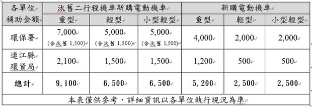 以往舊型電動機車因性能不佳不適合本縣地勢起伏地形而被鄉親詬病,但近兩年電動機車技術已逐漸成熟且性能亦提昇許多,市場上各家廠商也推出多種款式迎合消費者需求。106年12月31日前汰舊二行程機車並新購通過認證電動機車,最多將可獲得環保署7,000元補助,加上本局再加碼2,100元補助,總計補助金額高達9,100元,若單純新購電動機車仍可獲得5,200元,詳細資訊請參考表一,也歡迎鄉親洽詢本局污染防治科0836-26517轉270劉先生或長慧環境科技有限公司0912-278814林先生。