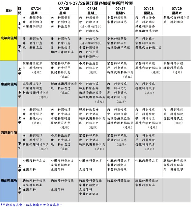 0724-0729連江縣各鄉衛生所門診表
