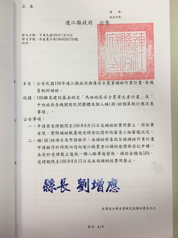 有機質肥料補助受理登記公告
