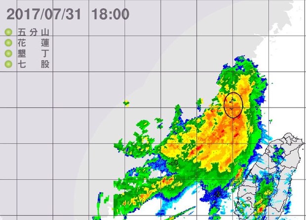 從18:00時雷達回波圖看未來3小時馬祖地區還需防範強降雨(照片中圓圈中),降雨強度比17時稍弱。(圖文由曹爾章提供)