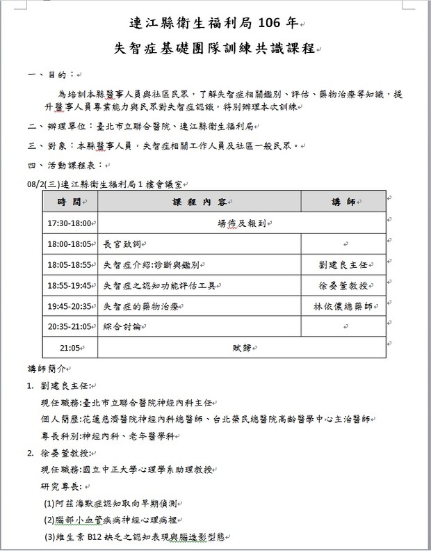 一、目的:為培訓本縣醫事人員與社區民眾,了解失智症相關鑑別、評估、藥物治療等知識,提升醫事人員專業能力與民眾對失智症認識,特別辦理本次訓練
