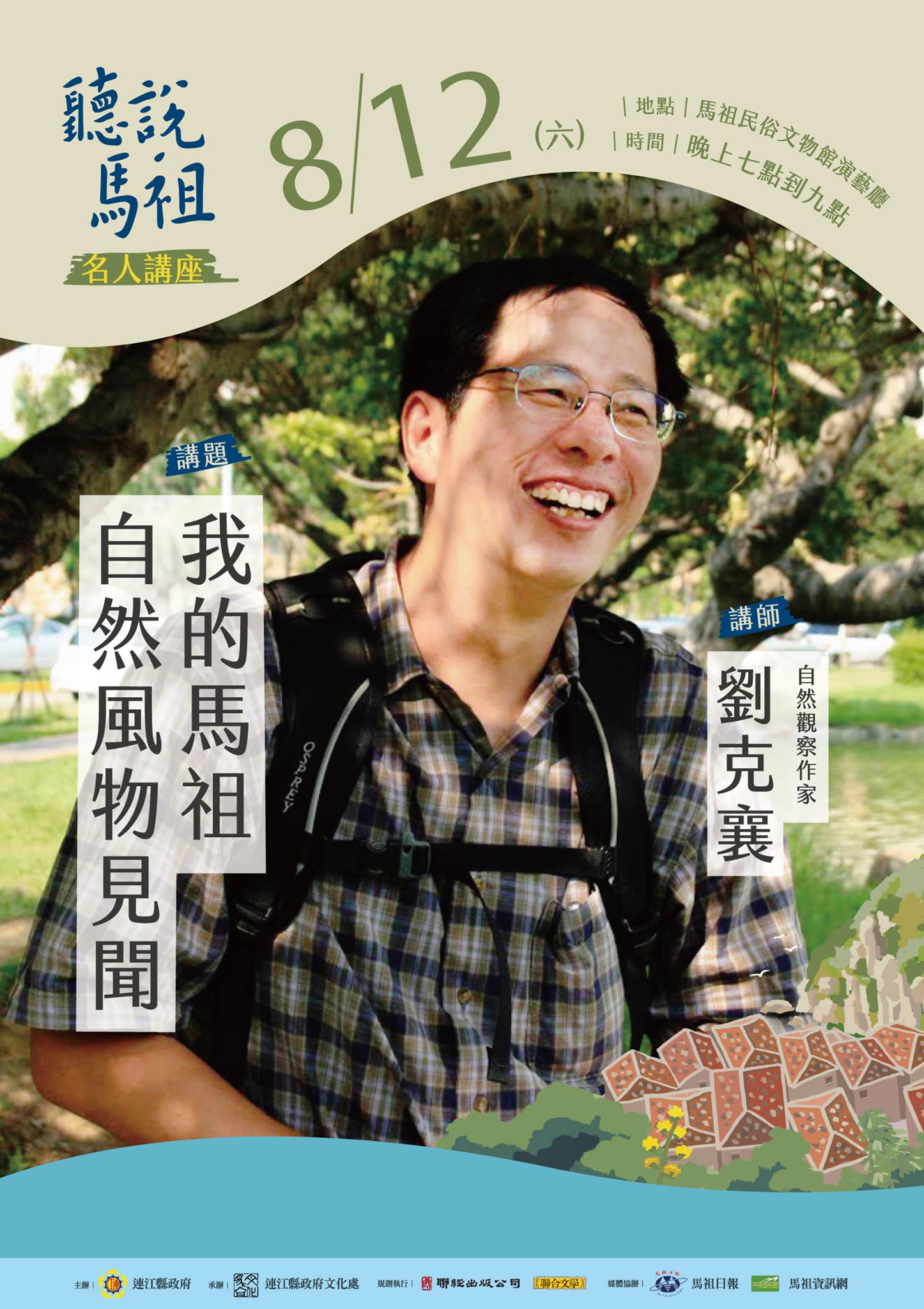 久等了!縣府文化處人文講座系列活動的名人開講,首場次終於敲定,將邀請曾多次赴馬祖踏查的劉克襄老師,於8月12日晚間7時在民俗文物館演藝廳,以「我的馬祖自然風物見聞」為講題,與民眾分享馬祖的自然風光,歡迎各位鄉親蒞臨聽講。