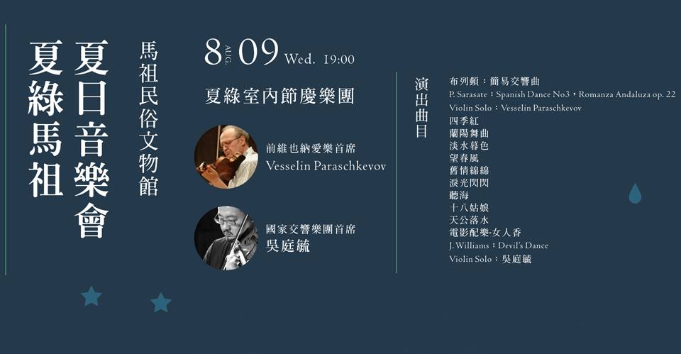 夏綠馬祖夏日音樂會就在8月9日! --閱讀人次 : 661 昨天夏綠節慶室內樂團在國家音樂廳演出,明天即將要在馬祖民俗文物館演出