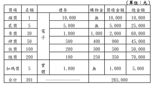 130,000元,另實體禮券5,000元,總金額共計265,000元,名額共