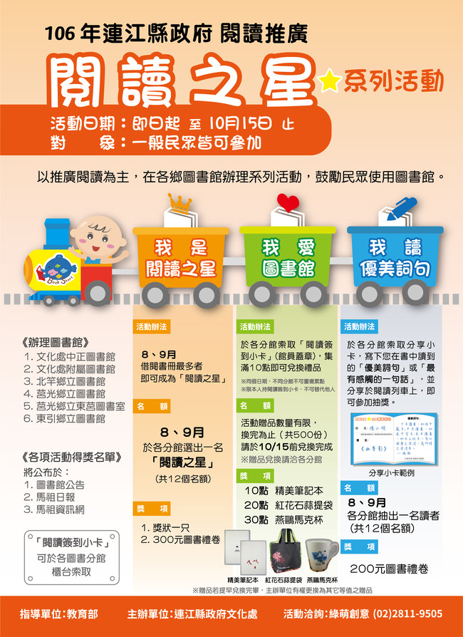 為鼓勵民眾使用圖書館,106年「閱讀之星」系列活動已於各分館展開,民眾凡借閱圖書及填寫分享小卡,都有機會得到圖書禮券,其中我愛圖書館的集點活動,更是人人皆有獎,詳細活動內容,可見活動海報或洽各館圖書館。