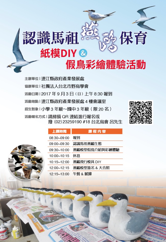 認識馬祖燕鷗保育DIY&假鳥彩繪[已額滿] --閱讀人次 : 903 [免費活動]認識馬祖燕鷗保育--紙模DIY & 假鳥彩繪體驗活動