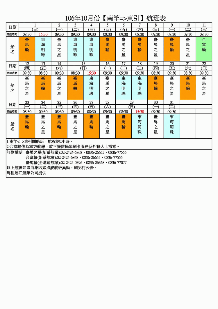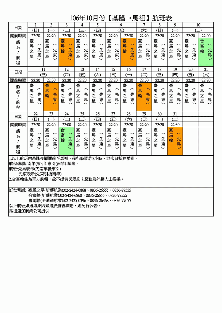 106年10月-臺馬及島際間航班表