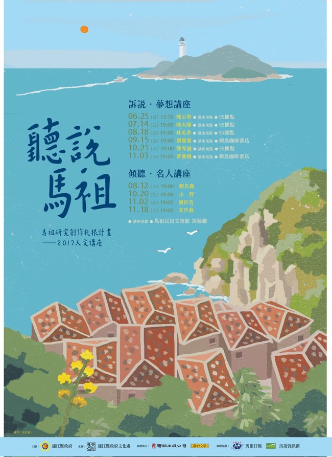 【聽說馬祖─2017馬祖人文講座】 ● 名人講座 11/ 2 謝哲青(知名電視節目主持人/作家) 11/18 安哲毅(資深影視工作者/植劇場製作人) ● 夢想成真講座 11/ 3 曹賽娥(畫家) ※ 主辦單位保有變動之權利。 ※ 更多講座即時資訊請至FACEBOOK:https://www.facebook.com/talk.to.matsu/
