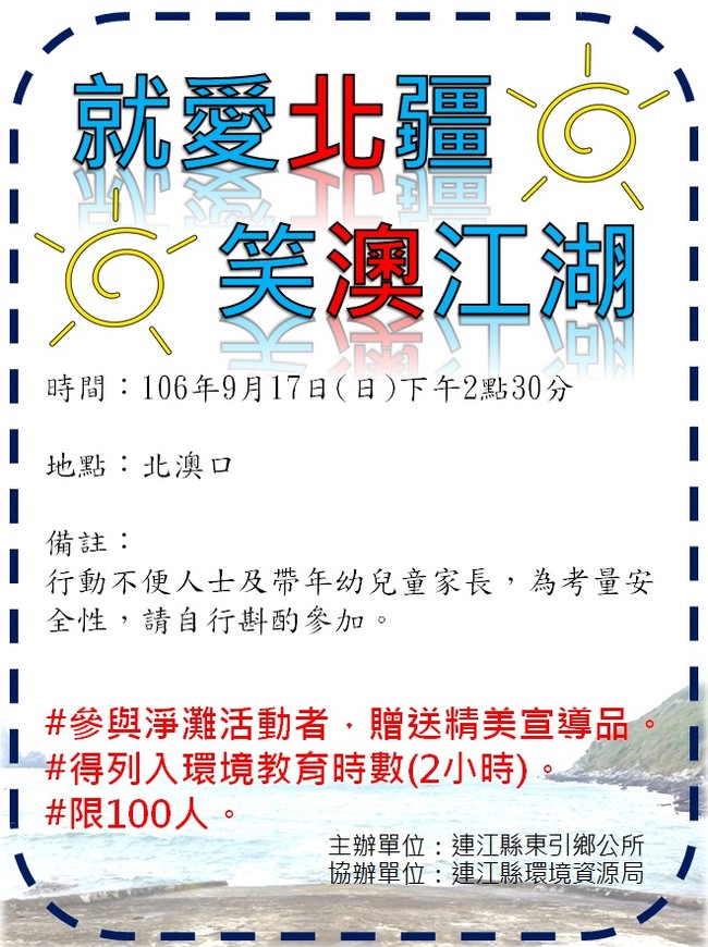 大家好,東引鄉公所訂於9月17日(日)下午2時30分於本鄉北澳口辦理「就愛『北』疆,笑『澳』江湖」淨灘活動。鄉公所誠摯地邀請各位鄉親踴躍參加,當日參與淨灘人員贈送精美宣導品一份(數量限100份),並可登記環境教育時數2小時。