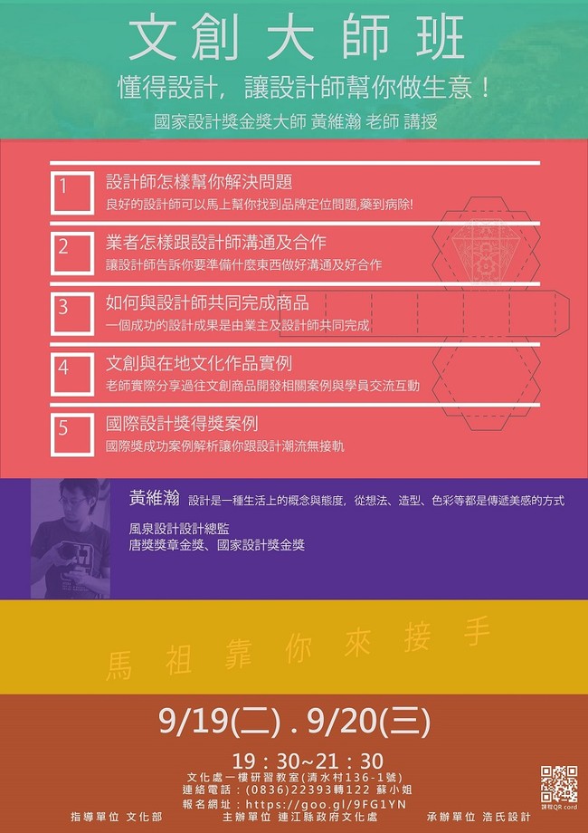 自台灣邀請風泉設計總監黃維瀚老師,讓學員「懂得設計,讓設計師幫你做生意!」,與學員分享在業界平面設計的相關案例經驗,歡迎對於文創產品有興趣的業者與民眾前來參與,與文創大師對談、討論、解惑,報名資訊可至https://goo.gl/9FG1YN連結報名或電洽(0836)22393轉122與蘇小姐聯繫。