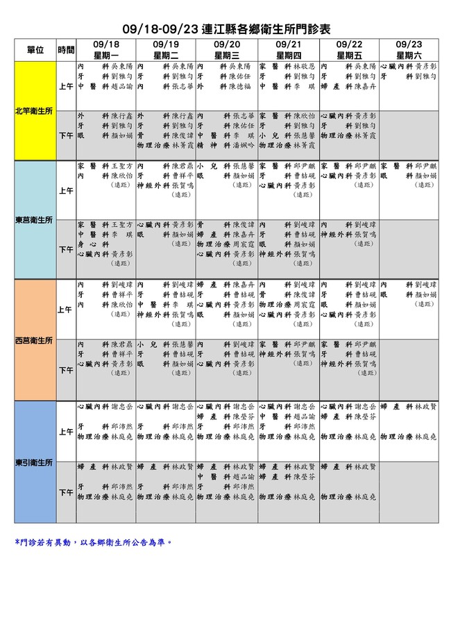 09/18-09/23連江縣各鄉衛生所門診表