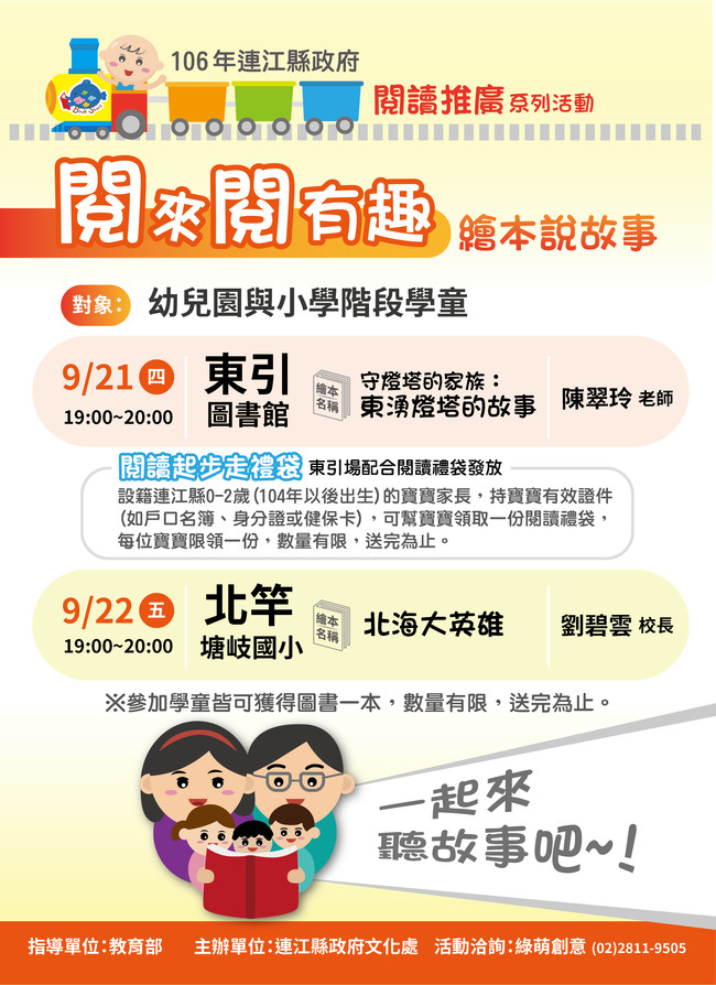 註1:9/21東引場次,將配合新生兒閱讀禮袋發放,以0~2歲嬰幼兒優先領取,每位寶寶限領一份,數量有限,發完為止。