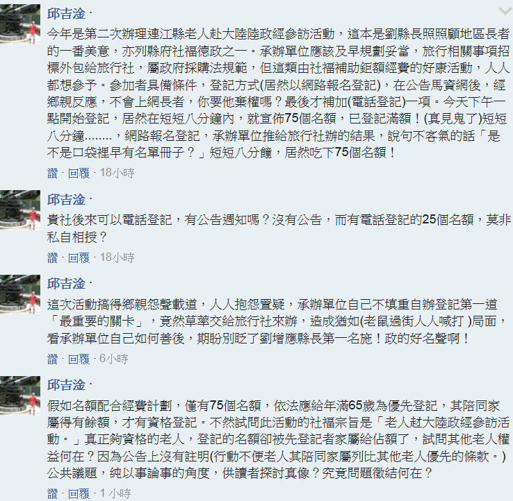 這項活動26日下午1時開放報名,75個名額「秒殺」,長輩反映採網路、部分採電話,因有的不會電腦。衛福局表示,實際報名情形高度踴躍,基於本縣推展社福政策照顧長者立意,即起調查本縣有意願參加者人數,以俾後續辦理相關作業。衛福局說,26日晚間即採取應變作業,對長輩熱烈支持及參與,表示歡迎,作業部分未能周全,敬請見諒。