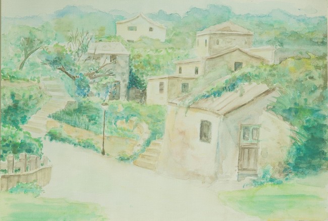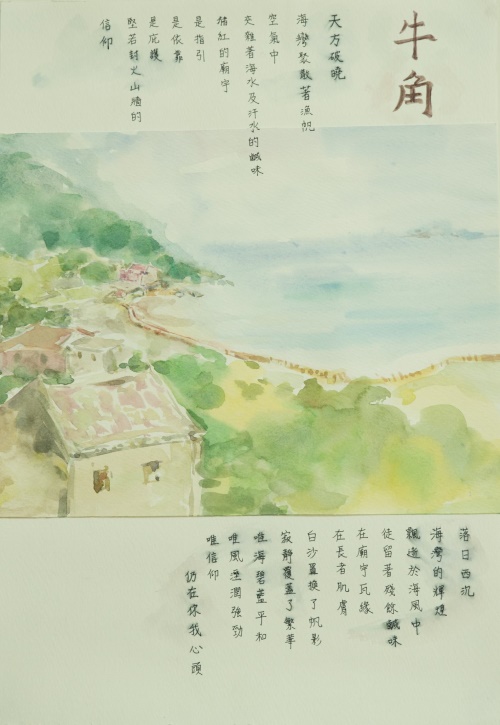 佳作:芹壁的美景一直是很多文學與藝術創作者所喜愛,古樸的石屋、靠海的山城,處處都是繪畫者的最佳取景之點,每一石階與小巷都讓人流連忘返,繪者以芹壁為景,表現小山城石屋之美,整幅畫以暖色調為主色調,顏色亮麗溫暖。