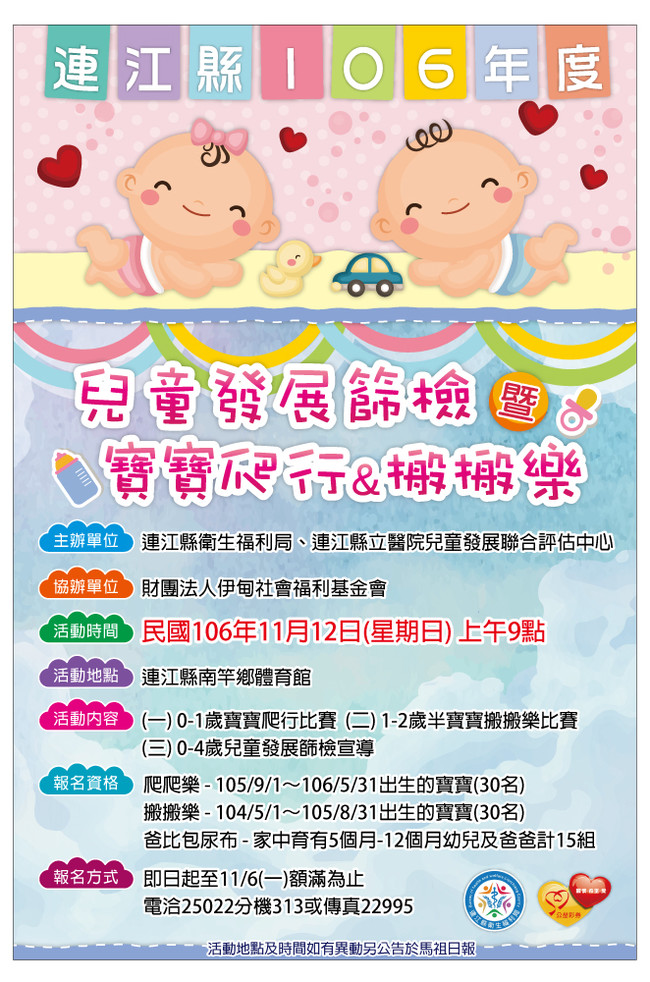 原訂於106年10月29日(星期日) 兒童發展篩檢暨寶寶爬行/搬搬樂活動,因故改至106年11月12日(星期日)
