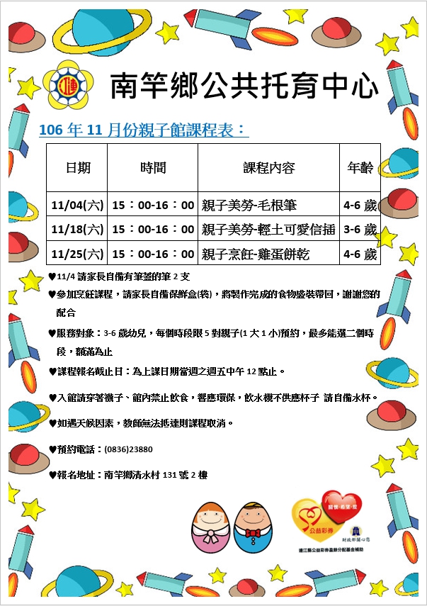 南竿公托11月報名 (11/18.11/25已額滿) --閱讀人次 : 803 11月份 親子館課程 開始報名囉!!!