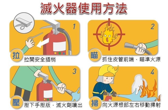 <熟記滅火器4字訣:「拉、瞄、壓、掃」 使用一次就上手!!!>
