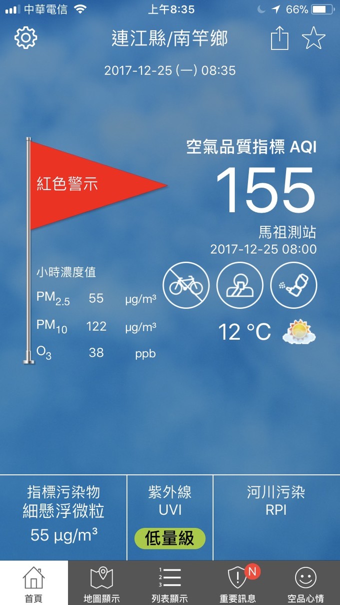 空污指標(AQI)已達對所有族群有影響 --閱讀人次 : 515 目前(12/25日08:36)空氣污染指標(AQI)已至155,為對所有族群不健康,一般民眾如果有不適,如眼痛,咳嗽或喉嚨痛等,應該避免戶外活動。學生亦避免從事劇烈運動。
