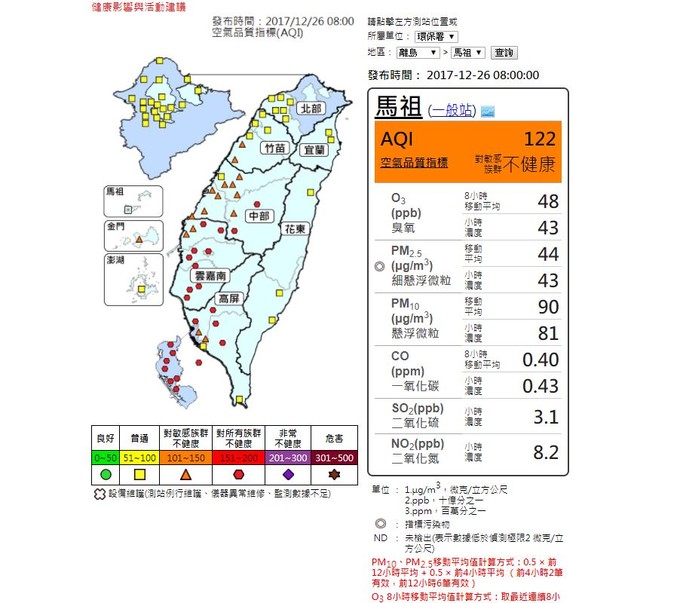 空污指標(AQI)已達敏感族群有影響 --閱讀人次 : 540 目前(12/26日08:00)空氣污染指標(AQI)已至122,為對敏感族群不健康,一般民眾如果有不適,如眼痛,咳嗽或喉嚨痛等,應該避免戶外活動。學生亦避免從事劇烈運動。