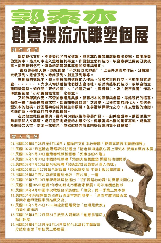 「郭素亦創意漂流木雕塑個展」歡迎參觀