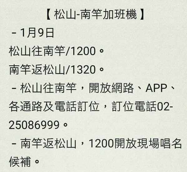 明天(1/9)立榮開1班加班機 C130軍機申請中