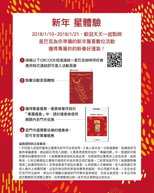 活動辦法: 每日皆可至數位活動畫面點燃鞭炮,獲得優惠憑證,優惠隨機跳出,持優惠憑證可至全台星巴克門市使用相關優惠。