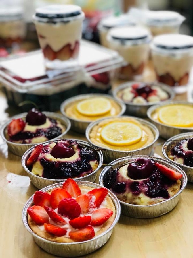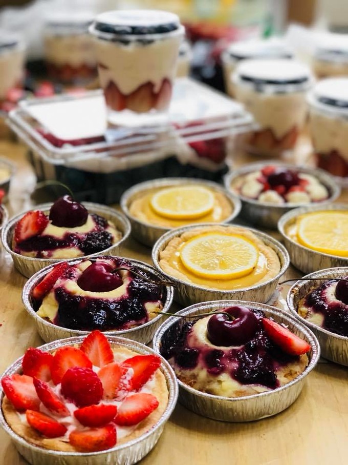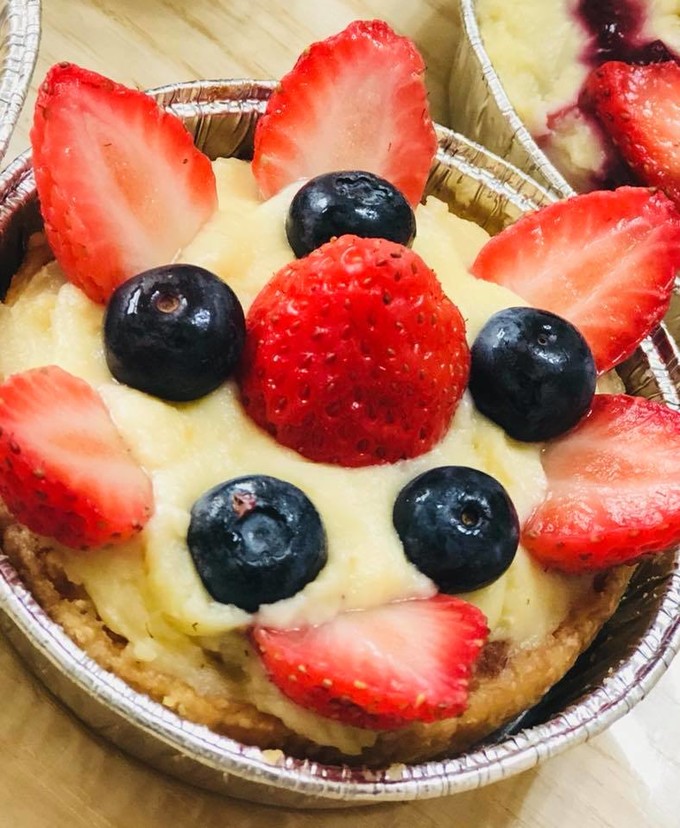 以杏仁奶油餡為底,再抹上滿滿香草卡士達,最後淋上綜合莓果醬,並使用智利進口新鮮黑櫻桃搭配草莓片裝飾