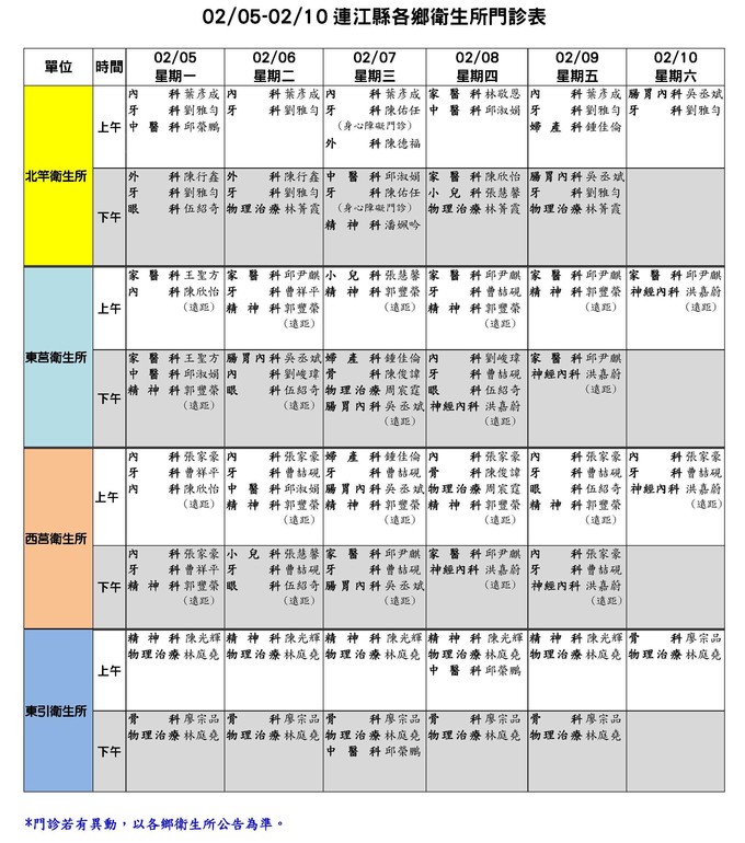 02/05-02/10連江縣各鄉衛生所門診表