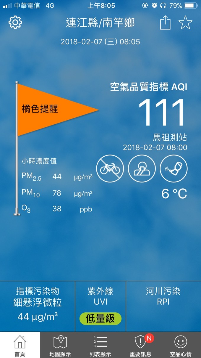AQI指標已達對敏感族群有影響 --閱讀人次 : 406 目前(2/7日08:00)空氣污染指標(AQI)已至111,為對敏感族群不健康,一般民眾如果有不適,如眼痛,咳嗽或喉嚨痛等,應該避免戶外活動。學生亦避免從事劇烈運動。