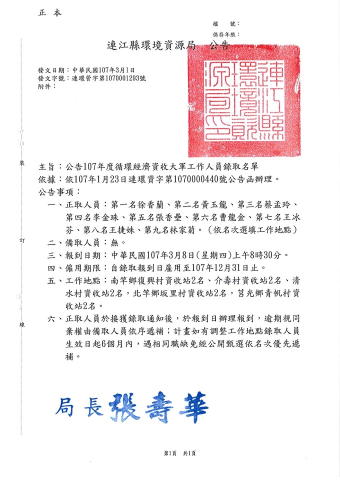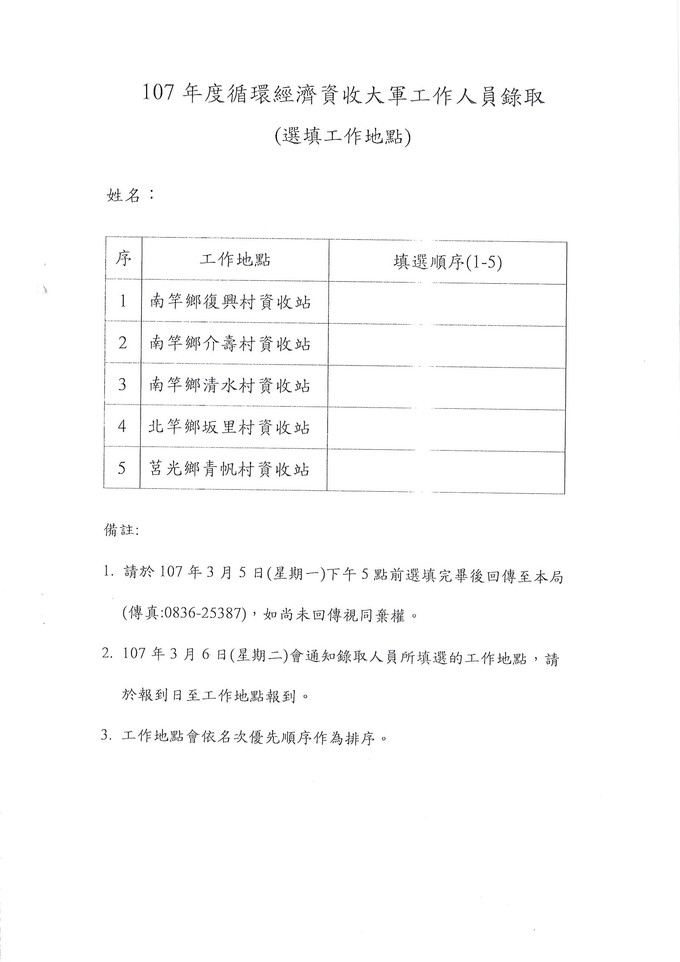 1.請於107年3月5日(星期一)下午5點前選填工作地點並回傳至本局(傳真:0836-25387),如尚未回傳視同棄權。