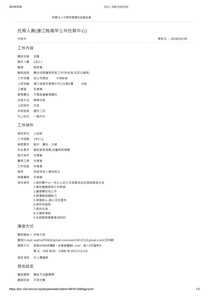 南竿公托誠徵托育人員