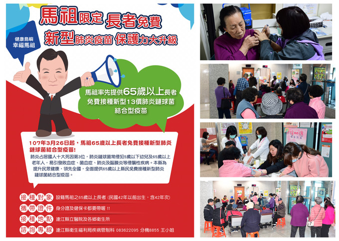 新型肺炎疫苗★馬祖限定★長者免費 --閱讀人次 : 695 3月26日起,本縣領先全國,率先提供地區65歲以上長者,免費接種新型肺炎疫苗【13價肺炎鏈球菌結合型疫苗(PCV13)】。各鄉醫療院所於3月26日~4月13日間排定疫苗接種門診,4月13日以後門診時間則另行公告,請鄉親攜帶【身分證及健保卡】,儘早完成疫苗接種,完成接種者可獲精美宣導品1份。