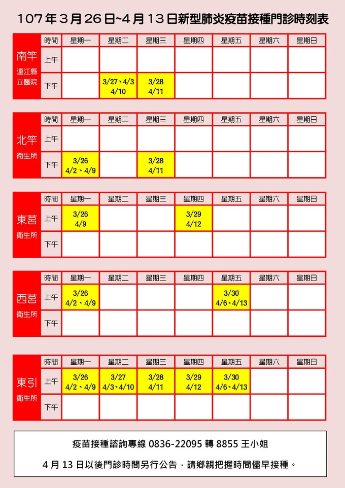 有關疫苗接種相關疑問歡迎電話洽詢連江縣衛生福利局疾病管制科0836-22095分機8855王小姐。