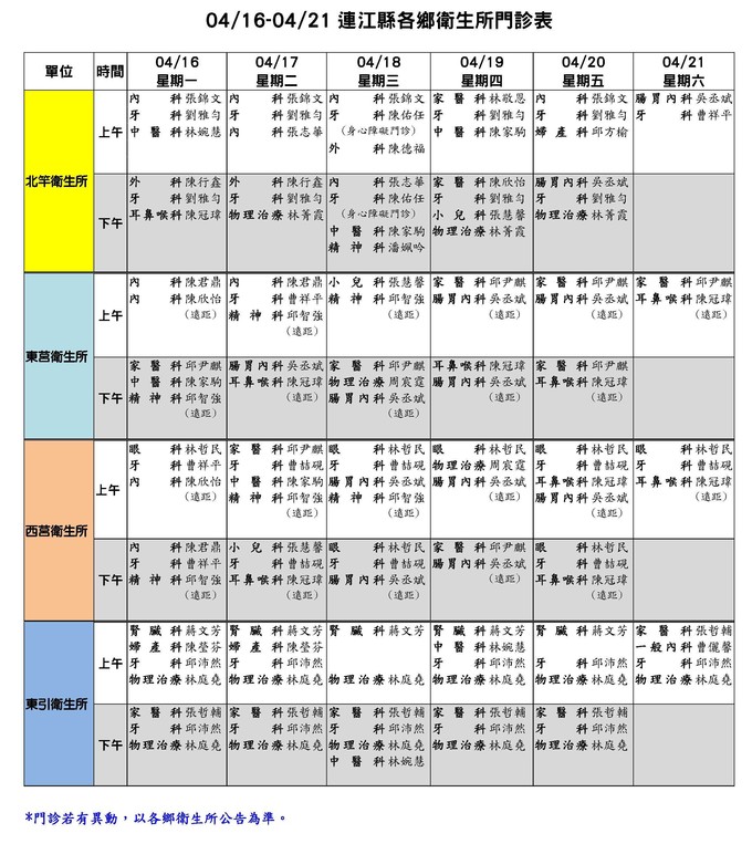 04/16-04/21連江縣各鄉衛生所門診表