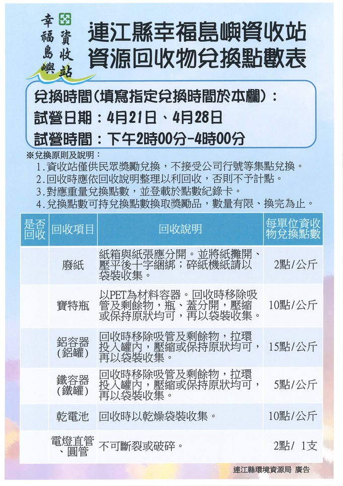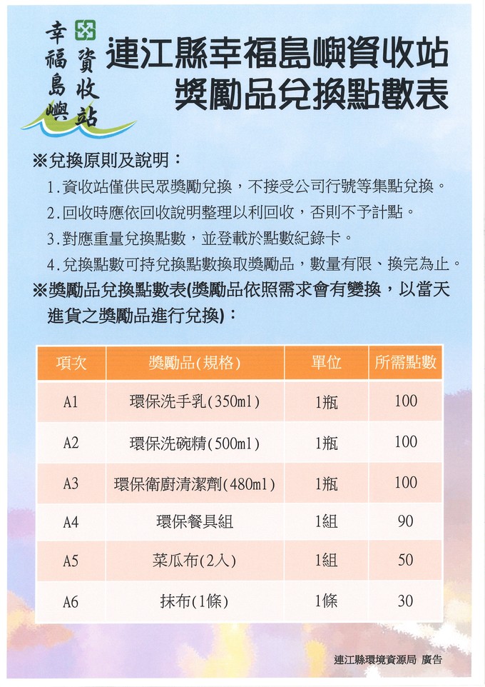 歡迎各位鄉親帶著家中資源回收物至資收站換取點數,集點兌換豐富禮品