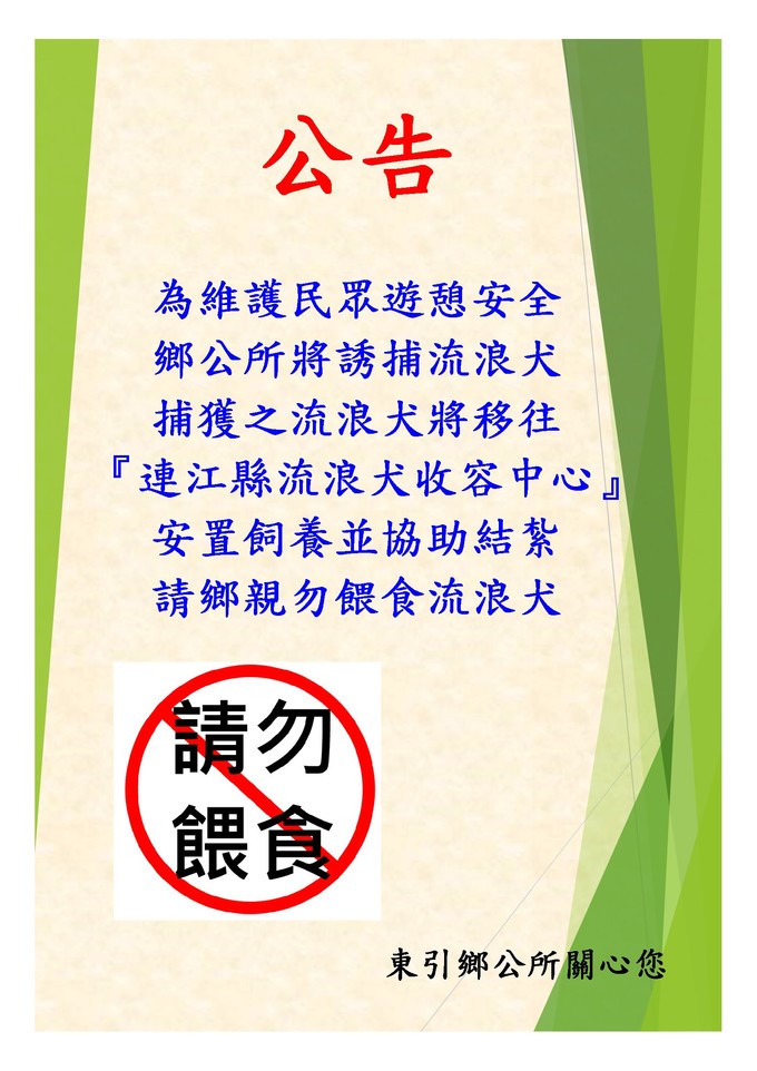 近期常出沒流浪犬,為民眾安全與環境清潔,鄉公所已進行誘捕流浪犬,發現有鄉親自行餵食行為,造成捕抓不易,請鄉親勿餵食流浪犬,與鄉公所一起攜手合作為東引打造更美好的環境生活。