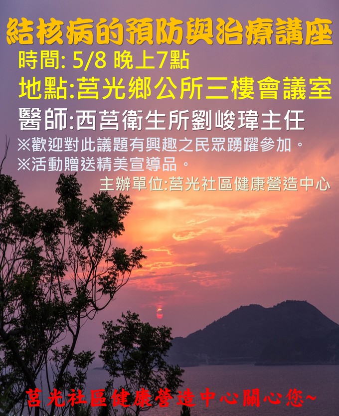莒光社區健康營造中心5月8(星期二)晚上7點在莒光鄉公所三樓會議室辦理「結核病的預防與治療講座」宣導活動,歡迎鄉親踴躍參加。凡全程參加民眾贈送精美宣導品1份。