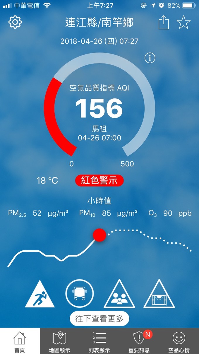 AQI指標已達對所有族群有影響 --閱讀人次 : 511 目前(4/26日07:00)空氣污染指標(AQI)已至156,為對所有族群不健康,一般民眾如果有不適,如眼痛,咳嗽或喉嚨痛等,應該避免戶外活動。學生亦避免從事劇烈運動。