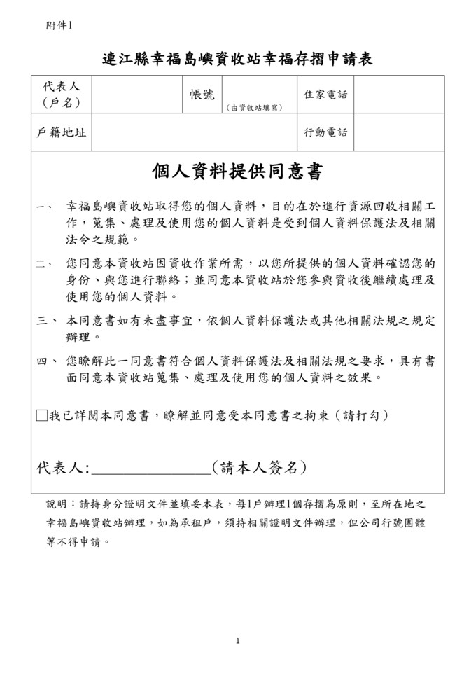 開戶申請表如表1 (開戶須持身分證明文件以備查驗,每1戶以辦理1個存摺為原則)