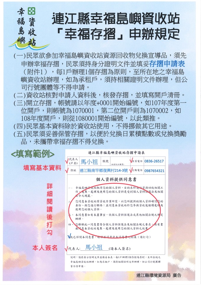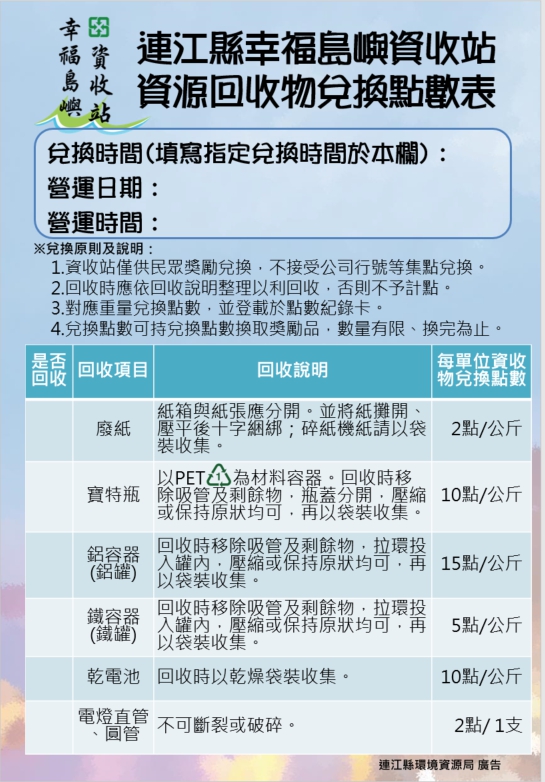 南竿鄉幸福島嶼資收站將於5月5日啟用 --閱讀人次 : 705 歡迎各位鄉親帶著家中資源回收物至資收站換取點數,集點兌換豐富禮品