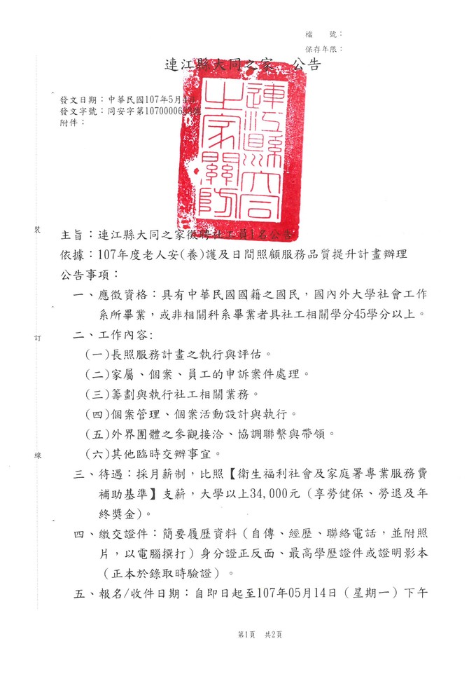 連江縣大同之家徵選社工員公告