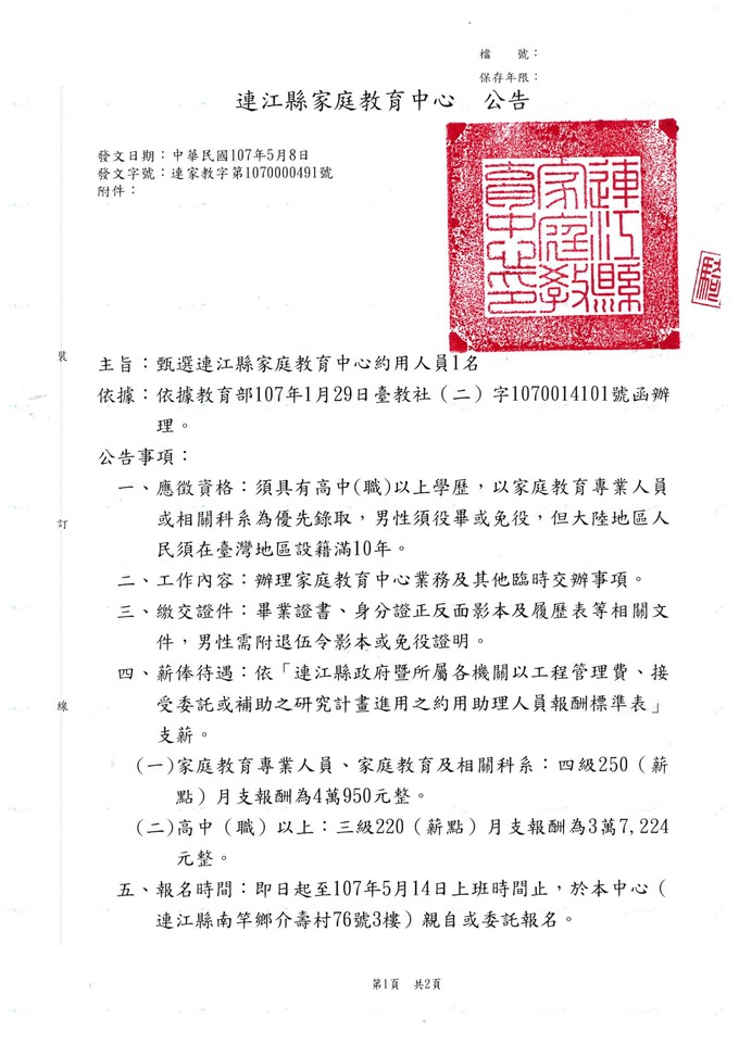 連江縣家庭教育中心甄選約用人員1名
