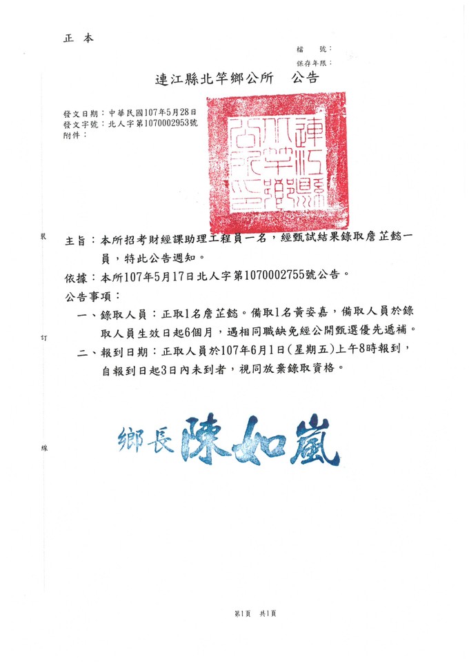 北竿鄉公所助理工程員錄取公告