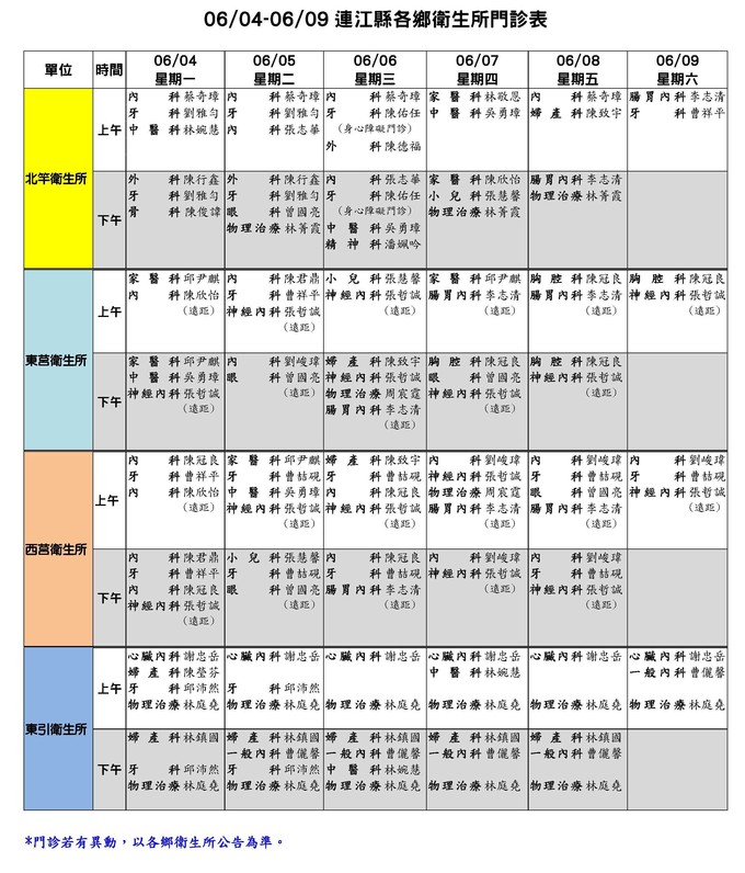 06/04-06/09連江縣各鄉衛生所門診表