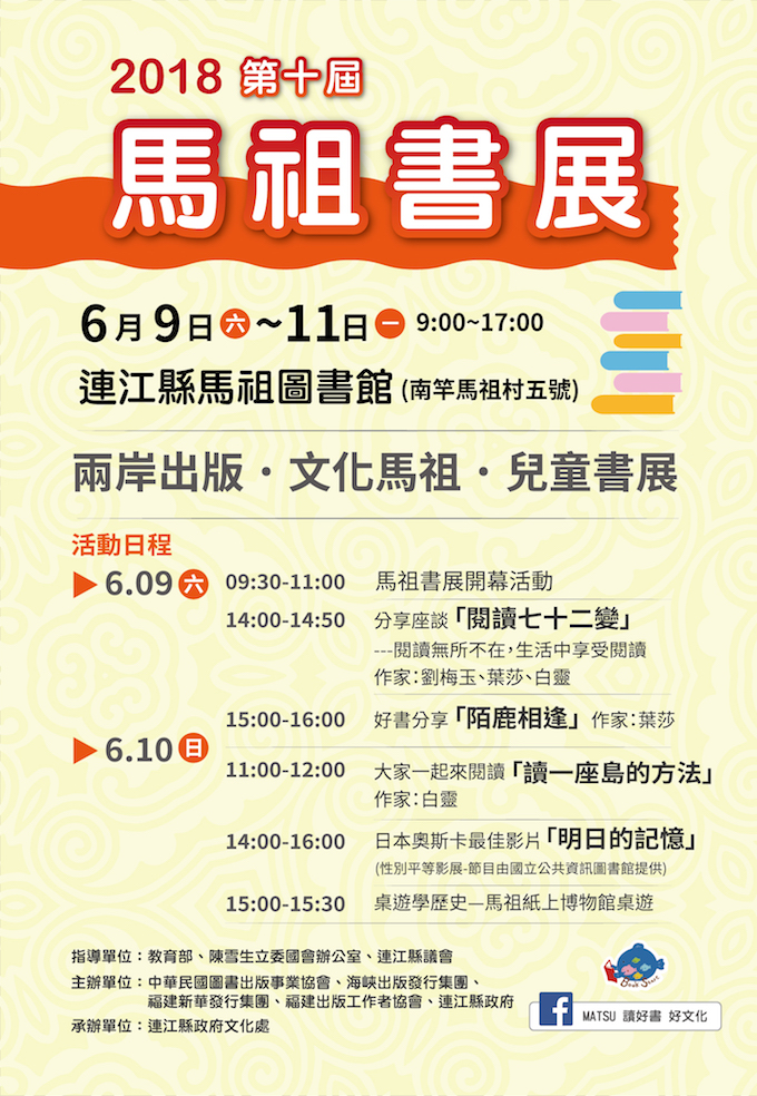 除了書籍展出,今年度馬祖書展另規劃了許多精彩活動,包括「詩人葉莎、白靈與在地作家劉梅玉的分享閱讀樂趣座談」、「新書分享會」、「電影欣賞」以及「馬祖桌遊」等,為期三天的閱讀嘉年華會,歡迎大朋友小朋友一同蒞臨參觀。