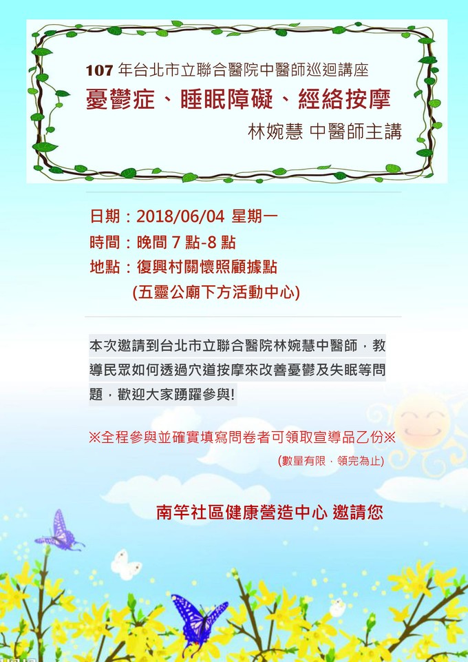 中醫講座-憂鬱症、睡眠障礙、經絡按摩