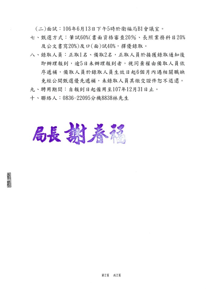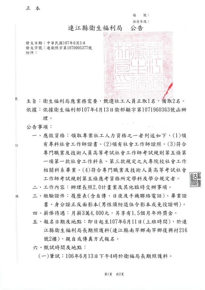 衛福局甄長照社工人員正取1名,備取2名