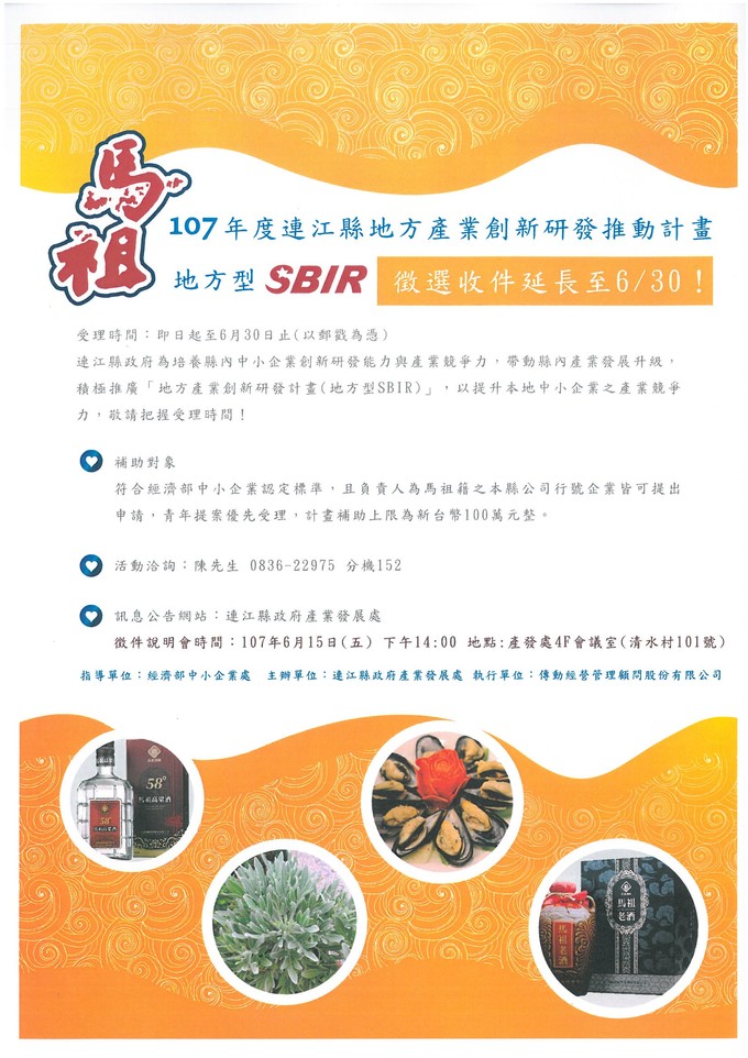 為了讓更多有意申請業者及青年有充裕的時間準備,連江縣107年度地方型SBIR計畫書受理截止日期延長至6/30!